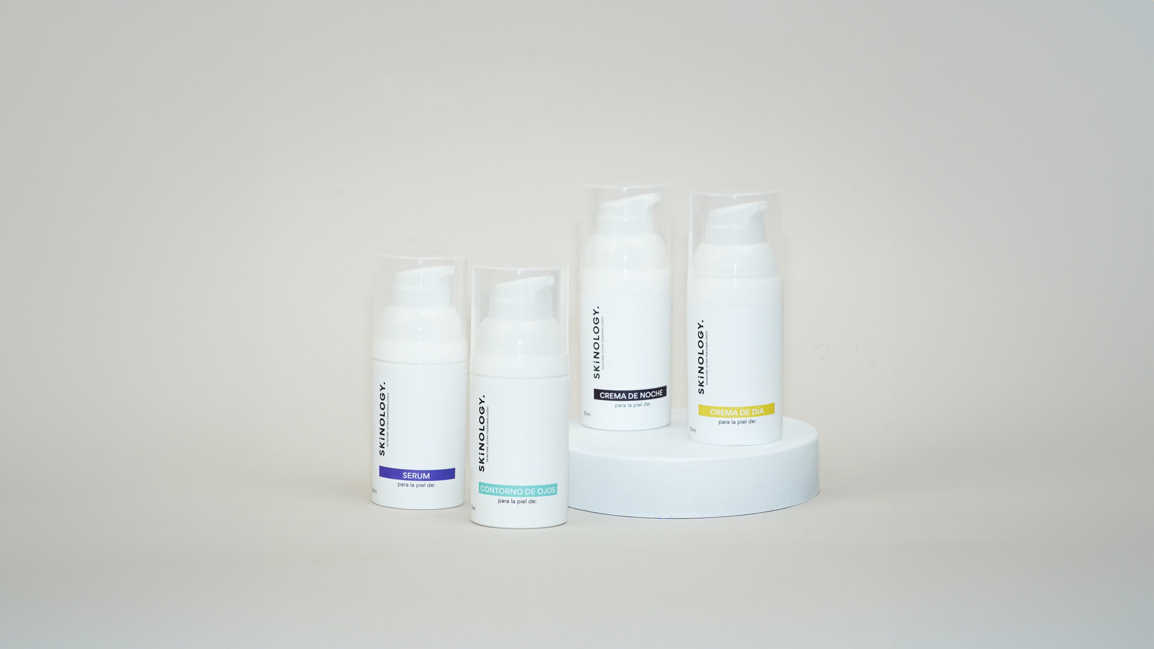 Tu rutina completa Skinology incluye cuatro productos base: sérum, crema de día, crema de noche y contorno de ojos. Cada uno está formulado a partir de tu diagnóstico, con activos seleccionados específicamente para ti (por ejemplo: ácido mandélico, niacinamida, retinol, elastina, cafeína, vitmamina C, entre otros). Así recibes una rutina completa, coherente y diseñada para evolucionar contigo.